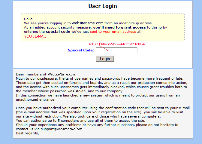 | What is Special Code? Special Code is a verification code that you need to enter on the verification page ![]() It is automatically sent to your email address by our system. [Top] |