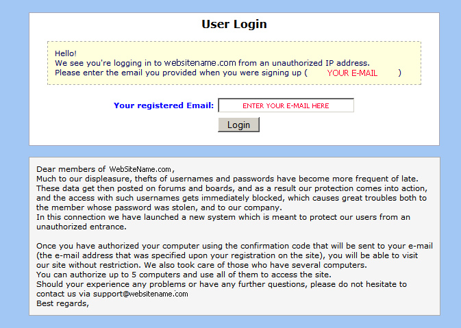 F.A.Q. VERIFICATION PROCEDURE: 1) Our system will offer you to enter YOUR email address, which you originally indicated during the registration of your account. Here is an example: ![]() Please enter your email address and tap or click "Login". A message with a special access code will be automatically sent to YOUR email address it will look like: ![]() In this message you will also find a link for the password change. Please use it immediately if you suspect that your password has been stolen. 2) On the next page you will need to enter the access code from the message into the "Special Code" box ![]() And tap or click "Login". After that you will get to the Members' Area. [Top] |